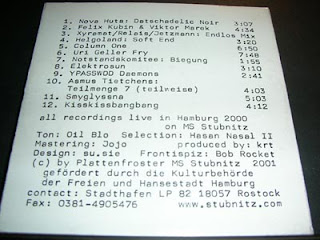 An excellent compilation of tracks recorded live on the MS Stubnitz, a large boat repurposed as a floating experimental music venue and here playing host to a cross-section of A-Musik/Staubgold/Stora-related electronica mavens (long my favorite sector of Germany's electronica culture) with Nova Huta, Felix Kubin & Viktor Marek, Helgoland, Kisskissbangbang and Asmus Tietchens' in particular turning in compelling work.